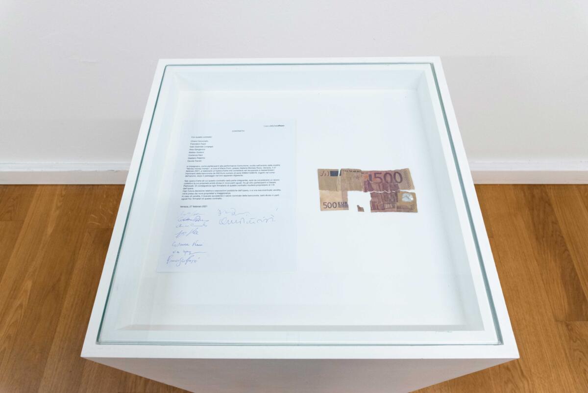 Ponendoci in stretta relazione con l’atto compiuto da Piero Manzoni per la sua Merda d’artista, i vari pezzi della banconota ritrovati e rimontati costituiranno la vera e propria opera che potrà ora percorrere tutte le tappe di un normale oggetto d’arte, mettendo in discussione il concetto stesso di creazione e di opera d’arte.